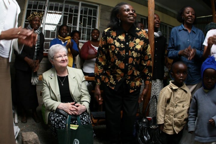 Sr. Anne Munley, IHM, President of Marywood University listening to proceeding of HIV/AIDS affected persons at Evangelizing Sisters of Mary in Ongata Rongai, Kenya. Gathered were seventy home health support teams, each of the seventy coordinates a team of twenty persons and their families in Kwale Slums all affected by HIV/AIDS.