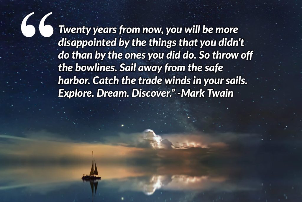 Twenty years from now, you will be more disappointed by the things that you didn’t do than by the ones you did do. So throw off the bowlines. Sail away from the safe harbor. Catch the trade winds in your sails. Explore. Dream. Discover. -Mark Twain