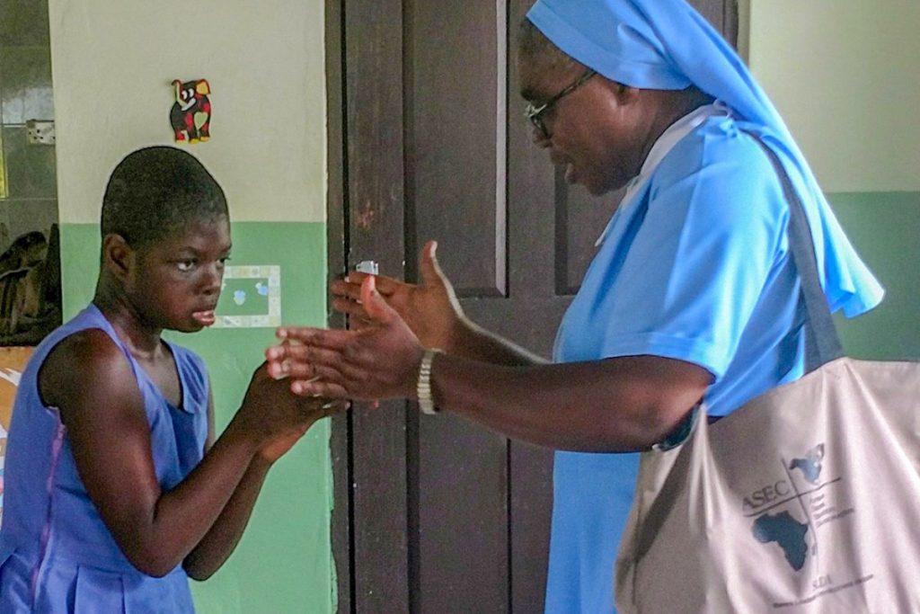 But one alumna from ASEC’s Sisters Leadership Development Initiative (SLDI) program is helping changing that reality by caring for and advocating on behalf of individuals with physical and mental disabilities. Sr. Zabibu Mipute Juliette, Daughters of Mary and Joseph (DMJ), is an SLDI participant studying Administration. She serves at St. Elizabeth Day Center for Children & Young Adults with Disabilities in the Cape Coast region of Ghana.
