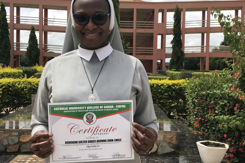 It has been 21 years since the founding of the Catholic University College of Ghana (CUCG), an ASEC-HESA partner institution. As part of the institution, the Faculty of Health and Allied Sciences provides courses that prepare students to meet challenges facing Ghana’s healthcare system. Despite its long history, the student president of the organization had never been a religious woman prior to 2021, when. Sr. Grace Akunna John-Emezi of the Handmaids of the Holy Child Jesus (HHCJ), a ASEC-HESA student earning her Bachelor of Science in Nursing, changed this statistic.